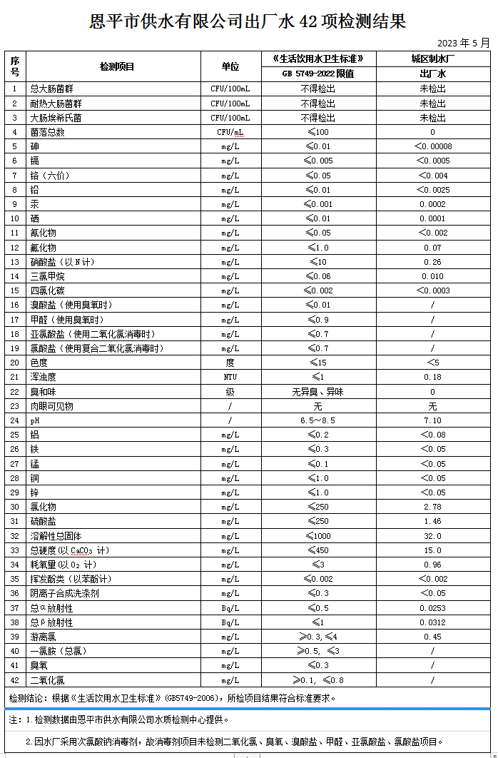2023年5月出廠水42項(xiàng)檢測(cè)結(jié)果